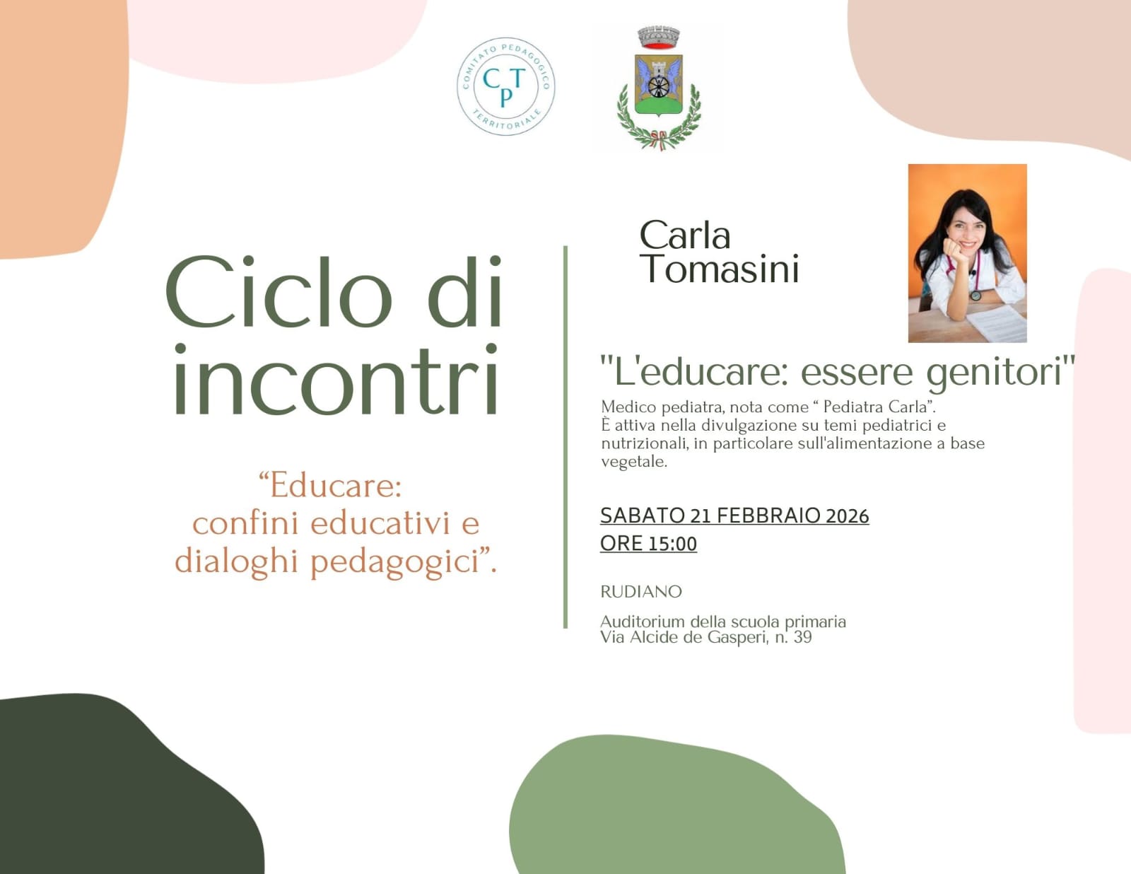 Il Comune di Rudiano invita la cittadinanza all'incontro con la dott.ssa Carla Tomasini dal titolo "L'educare: confini educativi e dialoghi pedagogici".