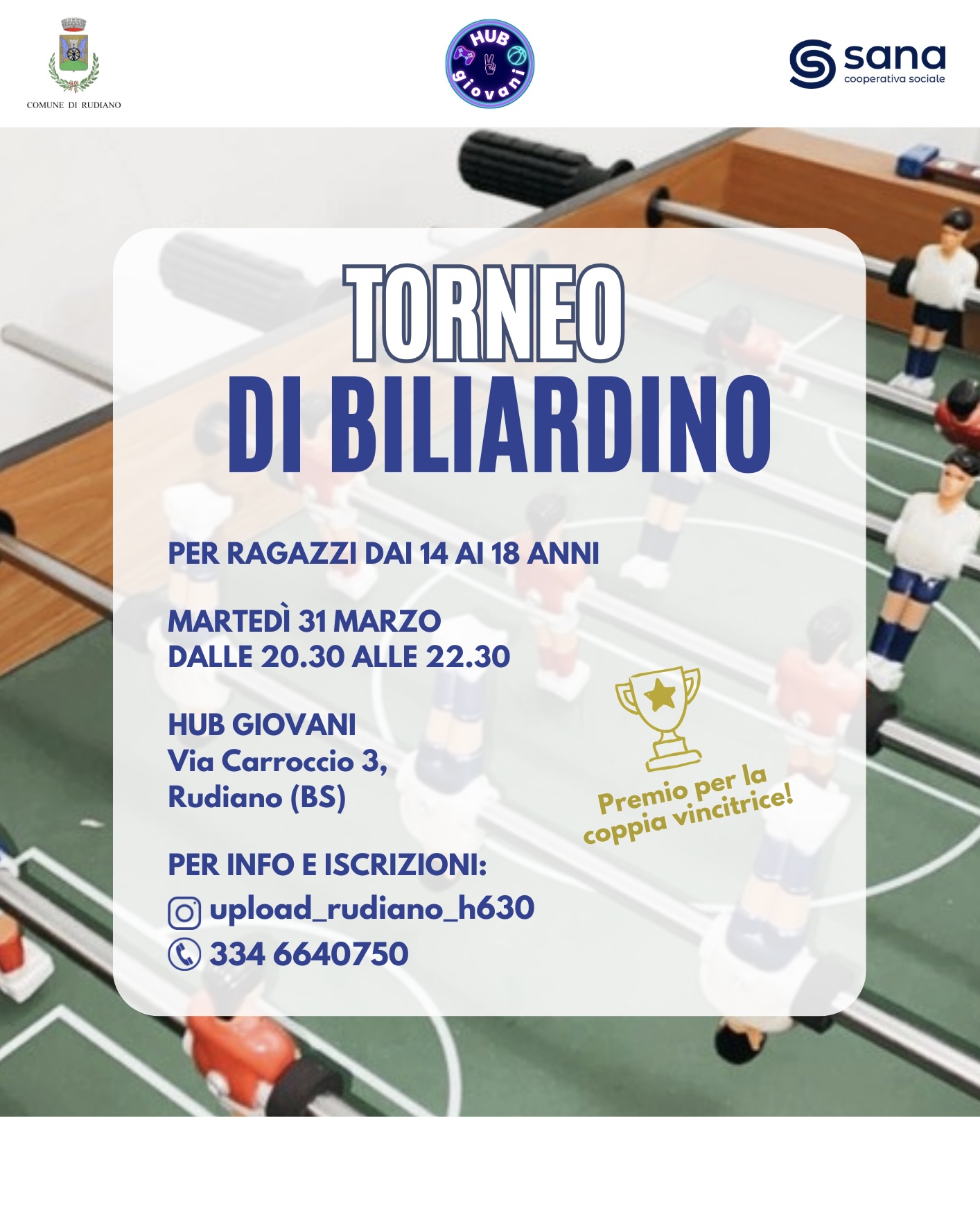 Il Comune di Rudiano, in collaborazione con l'Hub Giovani e Cooperativa Sana, organizza un torneo di biliardino rivolto ai giovani del territorio.