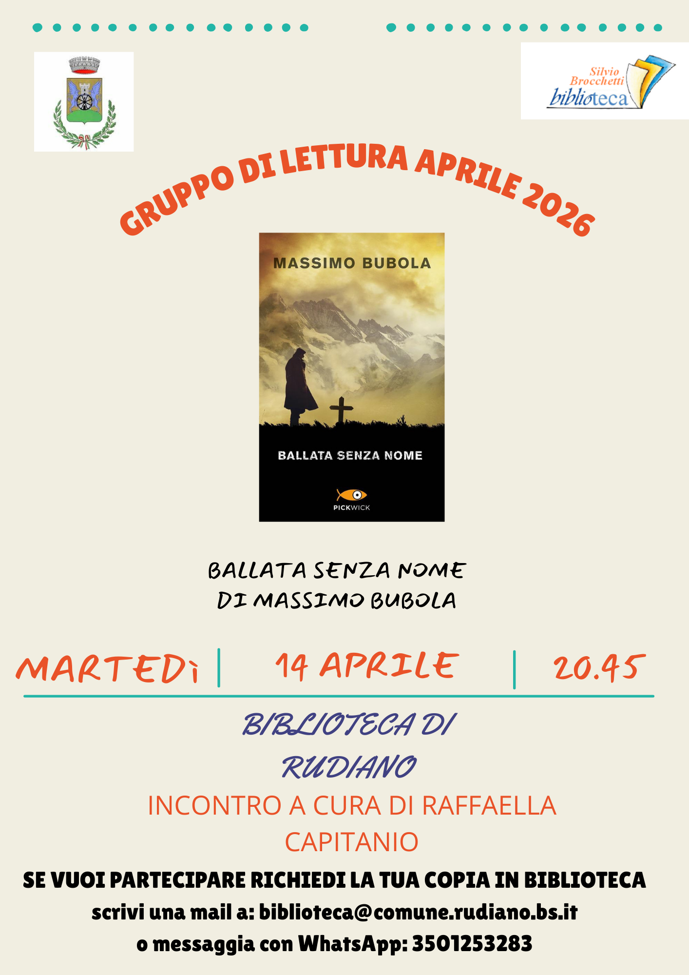 Il prossimo incontro sarà martedì 14 aprile 2026 alle ore 20.45 presso la Biblioteca di Rudiano, a cura di Raffaella Capitanio.