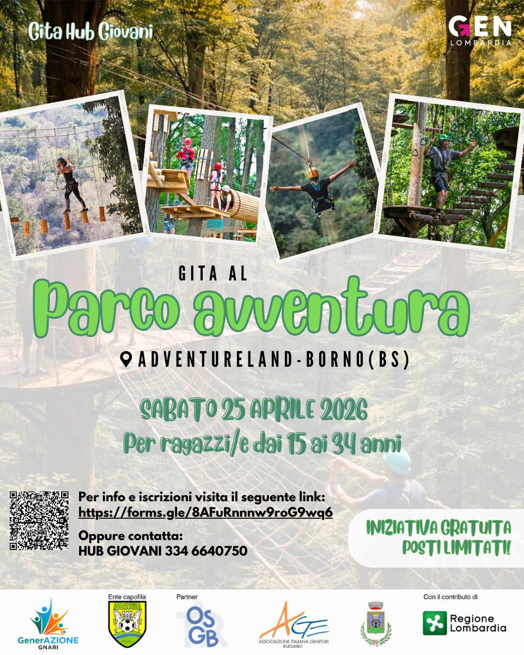 La gita sarà al parco avventura "Adventureland" di Borno (BS) sabato 25 aprile 2026 ed è destinata ai giovani dai 15 ai 34 anni.